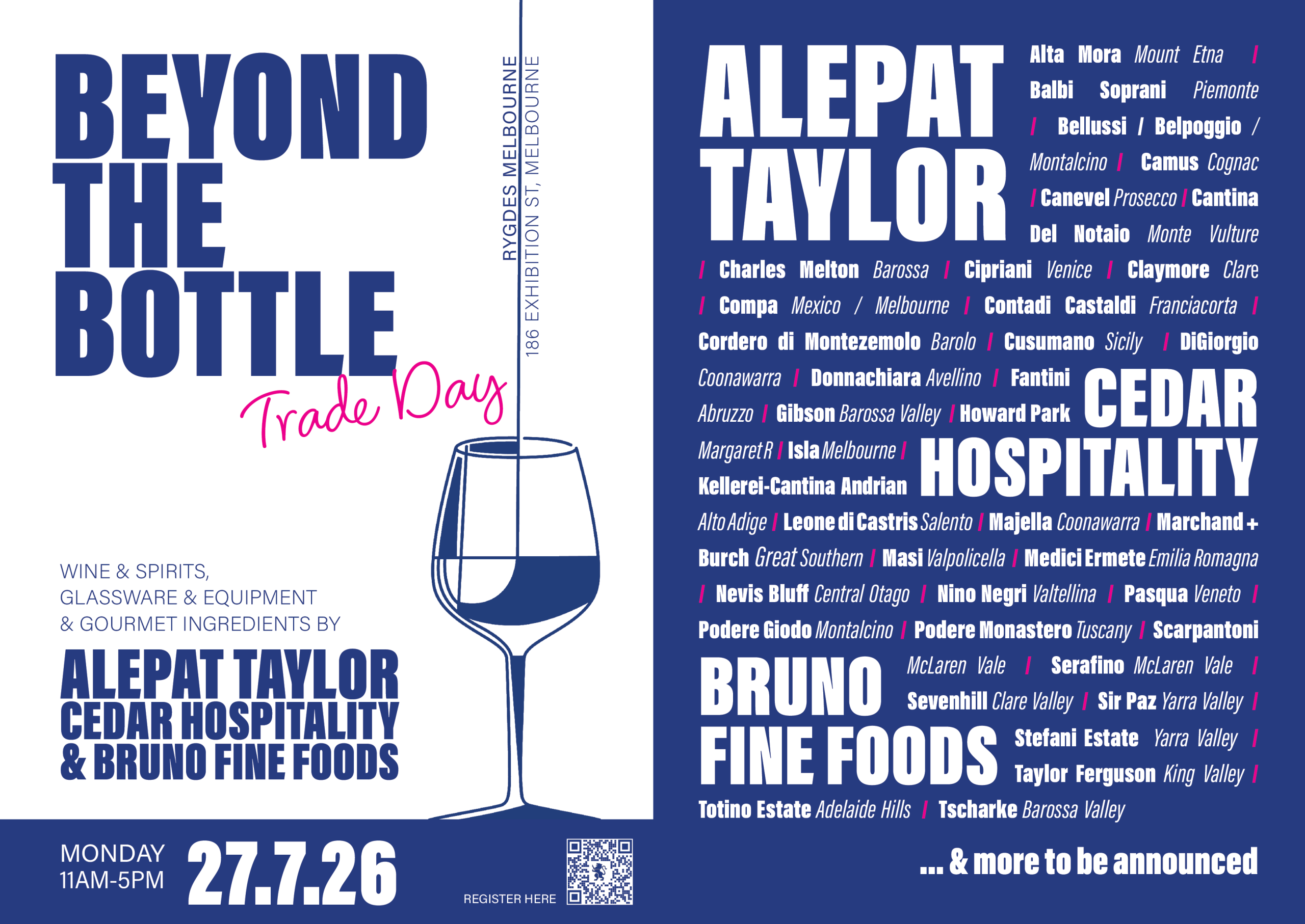 This year’s trade day will be bigger and better than ever. We’ll be taking over the whole of Rydges Centre Stage in Melbourne, and bringing all our Australian and imported producers of wines and spirits to the party. Also joining us this year, Cedar Hospitality, who will be showing us new range and innovation in glassware and equipment, while Bruno Fine Foods will be proffering delectable wares to keep you sated while you sip.