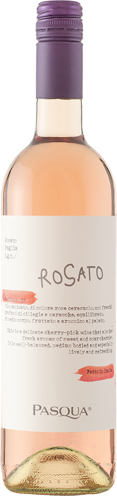 Pasqua’s rosé is from the Taranto and Brindisi areas of Puglia. The blend is 60% Primitivo, Puglia’s hero grape, partnered with 40% Sangiovese for a balance of berry and savoury character. All Pasqua’s rosato wines are all made with minimal skin contact, which not only produces the barely-there-blush colour, but keeps the flavours primary-fruit-driven and the mouthfeel light and bright. This is a dry rosé style with light body and a very drinkable sweet-and-sour cherry personality. It’s best served with starters, pasta dishes, baked fish or white meat